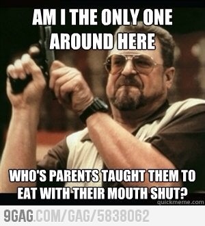 I always want to ask people, “Were you raised by pigs, is it a nasal problem, what?” Whatever it is, figure that shit out, because I do not need to see your food as it is chewed and swallwowed. And while we’re on that subject…